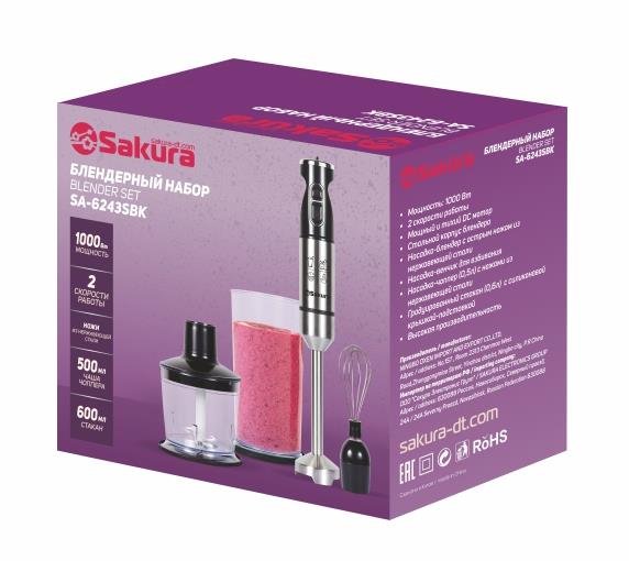 Блендер Sakura SA-6243SBK-1000 DC мотор 1000 Вт стальн.корпус венчик чоппер стакан (погружной/1000 Вт/серебристый, черный) - Интернет-магазин СОТА: бытовая техника, электроника, товары для дома и др.