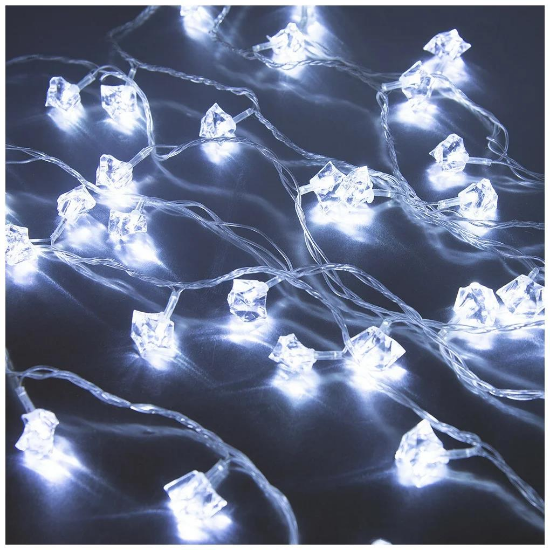 Комнатная гирлянда "Льдинки" с оригинальными лампочками в форме осколков льда подойдет для украшения елки или помещения как в новогодние праздники, так и внепраздничные дни для придания уютной атмосферы в помещении. Работает в 8 режимах, излучает холодный белый цвет. Длина шнура от вилки до начала гирлянды - 3м.