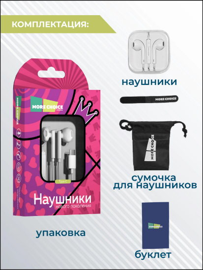 MORE CHOICE G12 Наушники вклыдыши Type-C разъем с МК и рег. громкости длина 1.2м Тип наушников: вкладыши Подключение к устройству: проводные Разъём: Type-C Динамик: 14.2 мм Частотный диапазон: 20-20000 Гц Чувствительность: 103дБ±3дБ Импеданс: 32 Ом Кабель: TPE высокой упругой тесьмой и эмалированных проводов Длина кабеля: 1,2 м