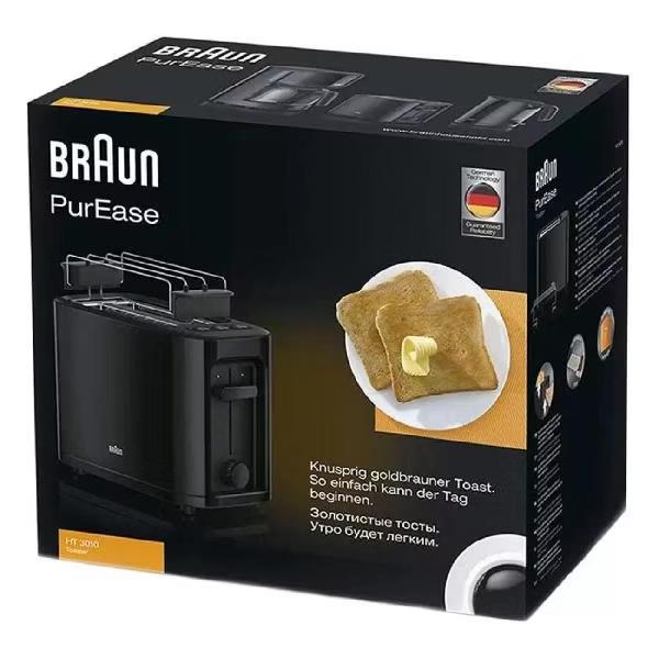 Многофункциональный тостер Braun PurEase HT3010 WH. Любители сэндвичей с ветчиной и сыром, сладких французских тостов с ягодами, итальянской брускетты с томатами и свежими травами оценят компактный и функциональный тостер Braun PurEase HT3010WH. Благодаря компактным размерам, этому бытовому прибору найдется место на любой, даже самой маленькой кухне. Тостер поджаривает два ломтика хлеба одновременно. Равномерность поджаривания тостов с обеих сторон обеспечивает автоматическое центрирование. Вы можете выбрать степень приготовления тоста: лишь слегка подогреть, подсушить ломтик хлеба, немного обжарить, поджарить его до золотистого цвета. Доступно 7 степеней обжарки, а также режим размораживания. Для подогрева булочек предусмотрены режим «разогрев» и специальная съёмная решёточка. Приготовленные тосты поднимаются автоматически. Вы можете в любой момент отменить задачу, нажав клавишу «стоп». Пользоваться тостером максимально удобно и просто. Клавиши управления находятся на верхней панели, рычаг и терморегулятор — на боковой. Поддон для крошек легко извлекается. Пластиковые стенки тостера термоизолированы и остаются холодными во время работы прибора.